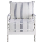 Light and bright as can be, this contemporary accent chair offers a cheerful look to any space. This accent chair offers comfortable seating with each cushion wrapped in a white linen-like upholstery accented with navy awning stripes. With a sharply designed frame that includes decorative spindle back posts, legs and armrests, all in bright white finish, this accent chair lends a subtle boho style. In addition, this accent chair offers extra details such as padded armrests and welt trim. Place this nautical-inspired accent chair on a covered veranda or a sunroom for a crisp, clean look. Key Features: • Brighten your décor with a matched awning stripe accent chair • Stylishly framed with white decorative spindle back posts, legs and armrests • Sinuous spring and pocket coil seat construction for lasting comfort • Reversible back cushion for added support • Constructed with solid hardwood, rubberwood, and fabric