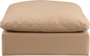 Give your space a whole new look with this tan Comfy vegan leather ottoman. This handsome ottoman fits nicely with other items in the Comfy collection and is a versatile seating option designed for adaptability, comfort and style. Wrapped in rich tan durable vegan leathered upholstery, this ottoman offers a plush embrace of overstuffed down feather cushions, carefully crafted to deliver the highest level of comfort. The perfect seat for creating an oasis for relaxation, this ottoman has thick foam surrounding its frame for added support and coziness.