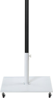 Bask in the shade wherever it's needed when you bring home this Fiji fabric and matte black aluminum patio umbrella with matte white base set. This ingenious umbrella and base can be used as a standalone umbrella on a deck or patio - or add it to your choice of table for a sturdy solution for hiding from the sun's rays. The aluminum pole weathers the elements like a champ, and the umbrella is crafted from water-resistant fabric for a beautiful, lasting look. Casters on the base make for easy portability.