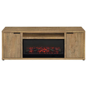 This fireplace media console brings warmth, storage, and charm to any living room or entertainment space. A built-in electric firebox with wireless remote control glows from the center, flanked by dual cabinets with adjustable shelves to neatly store electronics or accessories. The open cubby offers easy access to media components, while a mango wood-look finish adds natural appeal. Crafted from engineered wood with a durable laminate veneer, it functions as a TV stand, media cabinet, or entertainment center. Please note that this console does not include a heat function. Key Features: • TV stand fireplace console with electric flame visualizer and center cubby for media components • Mango finish enhances the realistic wood grain with warm and rustic visual texture • Two cabinet doors conceal adjustable shelves for organized and flexible storage • Center cubby features a clear glass insert and room for entertainment devices • Crafted from engineered wood with scratch-resistant and eco-friendly laminate veneer • Accommodates TVs up to sixty-five inches and includes a wireless remote for the firebox