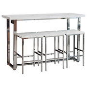 Stylish and versatile, this counter height table set exudes modern elegance. From kitchens to living rooms to rec rooms and more, it's perfect for adding extra seating and table space to any room in your home. The table is crafted with a scratch-resistant surface made from beautiful, white faux marble. The sleek, angular frames are crafted of metal in a gleaming chrome finish for a gorgeous touch of polish. This stunning set comes with one table and three stools to instantly complete your space. Key Features: • Four-piece counter height table set • Suitable as a game room table or sofa table for added function in your living room • Scratch-resistant table top with white marble pattern laminate • Table features built-in power outlet (2AC/2USB) • Constructed with steel, MDF, and laminate