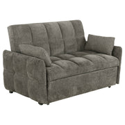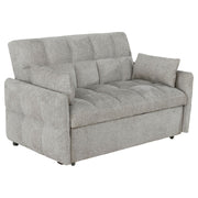 Bring versatility and comfort into your living space with this convertible sleeper sofa. Upholstered in soft chenille with all-over tufting, it combines cozy seating with a modern profile. Slim track arms and a rectangular backrest lend clean lines and contemporary appeal. The back folds flat for an easy transition into sleeping space, while a pull-out mechanism extends the lounge into a bed for guests. Crafted with a kiln-dried hardwood frame, sinuous spring decking, and high-resilience foam, it offers long-lasting comfort and support._x005F_x000D_ Key Features: • Light grey sleeper sofa bed upholstered in soft chenille fabric with tufted design • Back folds flat for an easy conversion from stylish sofa to sleeping surface • Pull-out sleeper mechanism extends the seat into a comfortable guest bed • Kiln-dried hardwood frame ensures strength and long-lasting durability • Sinuous spring decking with high resilience foam provides lasting comfort • Includes one-inch memory foam topper and two coordinating accent pillows