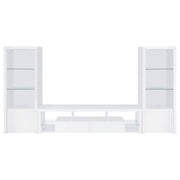 Elevate your entertainment arena with our sleek, modern TV stand. Drenched in a pristine glossy white-on-white finish, it radiates sophistication, accentuated by clear glass details. Its soft-close drawers ensure smooth operation, while glass shelves present a chic display option. Generous storage compartments cater to all your media needs. To enhance the ensemble, the set comes with matching media towers, amplifying storage capacity and offering a unified, stylish appearance. This combo not only meets functional demands but also serves as a captivating focal point in any contemporary space. Key Features: • Sleek, modern design with pristine glossy white-on-white finish and clear glass details • Soft-close drawers for smooth operation and glass shelves for chic display • Generous storage compartments to meet all media needs • Matching media towers to amplify storage capacity and create unified, stylish appearance • Captivating focal point for any contemporary space