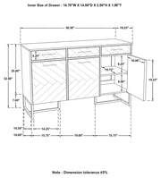 Elevate your space with this striking accent cabinet, blending natural wood tones with modern sophistication. Crafted from eco-friendly solid mango wood, the cabinet features a bold chevron pattern that adds depth and character. A sleek marble top offers a luxurious touch, while antique gold-finished metal legs and pull handles enhance its contemporary appeal. Designed for both style and storage, it includes three drawers and three spacious cabinets with interior shelving, making it perfect for entryways, dining rooms, or living spaces. Key Features: • Eco-friendly mango wood cabinet with a natural chevron pattern • Luxurious marble top adds elegance and durability • Three drawers and three cabinets provide ample storage space • Antique gold-finished metal legs and pull handles for a modern touch • Versatile design works as an entryway console or a dining room sideboard • Durable craftsmanship ensures long-lasting use in any home
