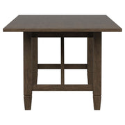 Create a soothing, relaxed ambiance in your welcoming dining room with a transitional five-piece dining set. The set centers on a rectangular table crafted in rubberwoods and graced with a warm, neutral brown finish. Angular support details add trestle-inspired style for a hint of farmhouse flair to the table, which includes an extension leaf for guests. Four side chairs are included, each boasting a matching wooden frame with a plush padded seat in neutral beige upholstery. Rectangular seat backs add rattan, bringing airy appeal and casual character in a kitchen or dining room. Key Features: • Clean lines and a mix of textures infuse character into a transitional five-piece dining set • Warm, natural brown wood grain finish pairs with a trestle-style table base • Charis features rattan backs in a light brown finish that creates warmth and engaging flair • Seats include plush foam padding and neutral beige upholstery fabric for a versatile look • Table includes an 18-inch extension leaf that's ideal for larger spaces, families, and entertaining