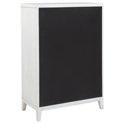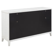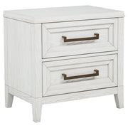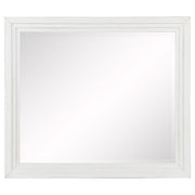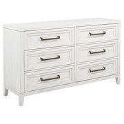 Embrace the fresh, contemporary style of a four-piece bedroom set. A distressed white finish highlights wood grain texture, while clean lines define the set with refined, inviting ambiance. The bed pairs a tall headboard and low footboard for an open profile adding to the modern appeal of this set. It includes a six-drawer dresser with a framed mirror, creating ample storage for clothing and linens. A two-drawer nightstand adds bedside storage and provides the perfect spot for a reading lamp or a vase of fresh flowers. Key Features: • A four-piece modern bedroom set offers a clean-lined silhouettes • Distressed white finish highlights wood grain details and bar hardware to create texture and depth • Six-drawer dresser and two-drawer nightstand offer plentiful storage and organization • The bed features a low footboard for an airy open look and requires a foundation