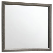 Modern design meets weathered appeal in this four-piece bedroom collection for a master or second bedroom. Each piece of the set has a gray oak finish with contrasting black accents and frames for a look that's understated yet bold. The queen bed has an impressive headboard and low footboard with black rectangular paneled accents. The elegant nightstand and dresser have deep drawers with lustrous silvery accented handles. The matching mirror has straight lines and is a perfect fit for the gorgeous dresser. Key Features: • Transitional style bedroom at a great value • Nickel finished hardware highlights two-tone grey oak finish • Black grooves create a dimensional look • Three-dimensional engineered foil paper laminate in grey oak and black • English dovetail drawer construction • Black finished legs are crafted of solid hardwood