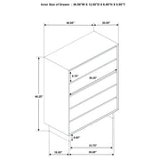 A compact footprint ensures that this modern four-drawer chest blends into any bedroom ensemble. Delivering handsome storage for clothing and accessories, the chest is complete with a felt lined top drawer that offers protection for delicates. Its four drawers include fingertip pulls, ensuring a smooth front. Mitered trim adds dimension and depth while a warm brown wood finish blends with any decor motif. Wide legs elevate the chest, creating an airy look and feel for your contemporary bedroom. Key Features: • Clean, straightforward design details bring stylish flair to a modern four-drawer chest • Crafted from solid wood in a warm brown finish • Fingertip pulls create a smooth, flat drawer front design, adding to a streamlined look and feel • Top drawer includes felt lining in a dark brown color, adding protection for delicate items • Drawers feature English dovetail joinery and metal glides for excellent performance