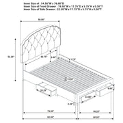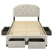 Indulge in comfort and utility with this platform storage bed, where graceful design meets everyday practicality. A tufted velvet headboard with gentle curves and nailhead trim brings refined elegance, while four built-in drawers offer generous hidden storage. Expertly crafted from rubberwood, engineered wood, and foam, this fully slatted frame eliminates the need for a foundation. It's a sophisticated solution for streamlined, serene living. Key Features: • Queen platform bed with scalloped tufted headboard for graceful tailored dimension • Cream velvet upholstery with button tufting and nickel nailhead trim for elegance • Includes four spacious drawers for concealed clothing or linen storage solutions • Fully slatted base supports mattress directly with no foundation or box spring • Built from rubberwood and engineered wood for stability, durability, and strength • Foam-filled headboard adds comfort while combining classic detail with function