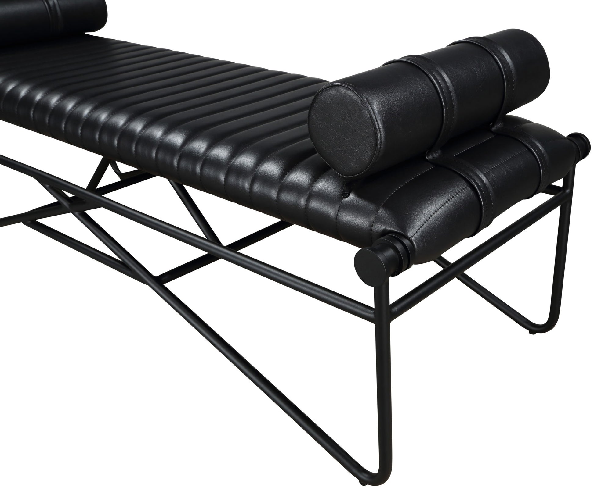 Elevate your space effortlessly with this Gatsby Vegan Leather Bench. Swathed in soft faux leather and anchored by a matte black iron metal frame, it boasts a contemporary design that's both sleek and stylish. The included rolled pillows give this bench an upscale yet comfortable look. Whether gracing your entryway with a touch of elegance or providing a chic accent at the foot of your bed, this versatile piece is sure to impress. Upgrade your home decor with this lovely vegan leather bench to give any space a touch of sophistication.