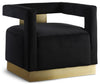 Liven up your living quarters with this unique Armani Accent Chair from Meridian Furniture. Featuring a square frame design with right angle openings at the arms and back, this chair puts the "mod" in modern. velvet upholstery gives the chair a soft, comfy texture that you'll want to get cozy with, and its steel base and back complements its dark upholstery while providing solid support. This chair is the perfect addition to any room in your contemporary home.