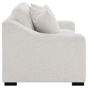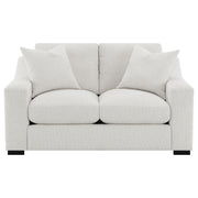 Create your transitional living room interior with this contemporary, white loveseat, upholstered in a white trillium polyester blend fabric throughout its sloped track armrests and top -stitched reversible cushions. A solid wood frame offers long-lasting support and stability as cappuccino finished block legs create a striking contrast. Key Features: • Soft sloped, wide track arms • Relax in trillium filled cushions that create a down-like seating comfort • Reversible seats and backs • Boxed seat and back cushions with top stitching for a tailored look • Wide solid wood legs in cappuccino complement the arm width
