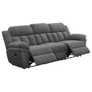 Design a living room built for comfort and relaxation around this transitional reclining sofa. Offering dual recliners operated with a side pull lever, the sofa encourages rest and rejuvenation in inviting style. Charcoal upholstery delivers a smooth, soft look and feel, while plush cushions are both supportive and comfortable for lounging. Pillowtop armrests are ideal for curling up on a cool evening or indulging in a quick afternoon nap. Tufting accents add support and structure to plush cushions while creating a dimensional look that works in your living room. Key Features: • Dual recliners operated with side pull lever for rest and relaxation • Charcoal upholstery for a smooth, soft look and feel • Plush cushions for supportive and comfortable lounging • Pillowtop armrests for curling up on a cool evening • Tufting accents for support and structure with a dimensional look
