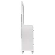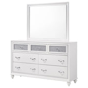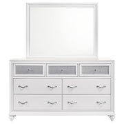 Elevate your bedroom with the glamorous appeal of this dresser and mirror set. The seven-drawer dresser showcases sparkling acrylic panels on its top drawers, complemented by faceted crystal hardware for radiant elegance. A crisp white finish highlights its clean silhouette, while turned bun feet add a timeless touch. The coordinating mirror features a beveled wooden frame that reflects light beautifully, enhancing the dresser’s bold style. Built with solid rubberwood, engineered wood, and okume veneer, this set balances chic design with lasting durability._x000D_ Key Features: • Seven-drawer dresser with sparkling acrylic panels and crystal hardware • White finish enhances the clean silhouette and brightens bedroom spaces • Turned bun feet add a classic design detail to the glamorous presentation • Rectangular mirror includes a beveled wooden frame for elegant dimension • Frame built with solid rubberwood, engineered wood, and okume veneer accents • Two-piece set combines storage and reflection for a cohesive bedroom design