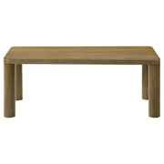 Balancing warmth with structure, this coffee table rests on cylindrical legs that anchor its linear profile. The softened corners and thick top deliver a subtle sculptural quality, while natural wood textures enhance its presence. Whether styled as a cocktail table or accent table, it invites relaxed connection and thoughtful display in the heart of the living room. Key Features: • Coffee table with rectangular top and round legs for a balanced modern profile • Brown oak finish emphasizes natural wood grain and tonal richness • Smooth corners and thick proportions create a grounded centerpiece • Crafted from solid rubberwood, engineered wood, and white oak veneer • Spacious surface supports books, trays, or decorative objects • Designed to coordinate with matching end table for full living room use