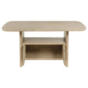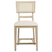 Create a stylish and functional dining space with this beautifully crafted counter-height dining set. Featuring a spacious counter-height table and matching chairs, this set brings natural elegance and modern comfort to your home. The table is crafted from solid wood, engineered wood, and oak veneer, with a smooth rectangular top and rounded edges for a refined look. Its base includes a convenient two-door cabinet, offering storage for dining essentials. The accompanying counter-height chairs feature hand-woven radio weave cane backrests and foam seat cushions upholstered in soft beige fabric for maximum comfort. Complete with brass-finished footrests for durability, this set is perfect for casual family meals or entertaining guests. Key Features: • Counter-height dining set includes a table and six matching chairs • Table crafted from solid wood, engineered wood, and oak veneer with a two-door cabinet base • Chairs feature hand-woven radio weave cane backrests and foam seat cushions upholstered in beige fabric • Brass-finished footrests on chairs for added durability and comfort • Blends natural elegance with practical functionality for modern or traditional spaces