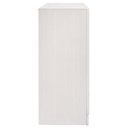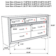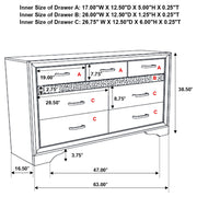 Infuse your space with sophisticated grace. The chic design of this beautiful dresser lends a touch of elegance to any bedroom. Felt-lined drawers keep delicate belongings safe and secure. A hidden jewelry drawer offers a discreet place to store your valuables. Complete with a glittery panel across the front, this piece exudes sparkling opulence. Key Features: • Nine-drawer dresser provides ample clothing storage • Hidden felt-lined drawer located behind glitter accent strip • Crystal hardware stands out against bright white surfaces • Smooth drawer operation with full-extension glides • Bracket-style base and beveled edges offer timeless form • Engineered wood and laminate build ensure durability