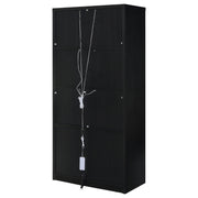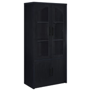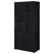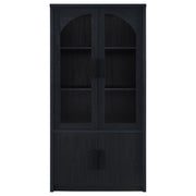 A dramatic silhouette and graceful arches come together in this striking display cabinet, where elegance meets purpose. Tall framed glass doors open to reveal a softly illuminated stage, casting warm light across treasured pieces. Below, concealed storage offers hidden utility behind panel doors, each compartment thoughtfully fitted with adjustable shelves. Cloaked in a deep black woodgrain, this cabinet brings quiet drama and timeless refinement to any curated space. Key Features: • Accent display cabinet with four doors including framed glass uppers and panel lowers • Black finish highlights the cabinet’s tall frame with modern depth and clean geometry • Upper doors reveal LED-lit display • Lower doors conceal dual compartments with two adjustable wood shelves inside • Arched glass doors soften the vertical lines with graceful contrast and elevation • Crafted from engineered wood, ash veneer, tempered glass, and laminate veneer