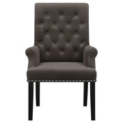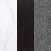 Bring together family and friends at this modern rustic style dining table set. The table features a rectangular, thick, white marble top that is spacious enough for six people. Sleek open and airy trestle base with a center punch out, rustic espresso striking color combination lends a dramatic touch and grounds the room elegantly. The set of chairs with a rolled backrest with button-tufted details lends a traditional aesthetic to a space. Also, bringing to your home the classic elements is a padded seat with individual nailhead trim that offers a charming detail. Key Features: • Refusing to choose between style and function, this rectangular table offers a place to share a meal with your family • The table is supported by an oak veneer panel base with a marble table top • An open trestle base lends a modern industrial flair • Plushily padded side chairs are adorned with rolled backs and button-tufted upholstery with bold nailhead trim