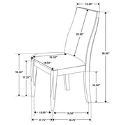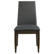 Bring a set of these beautiful contemporary side chairs to your dining table for a sophisticated touch. Designed with elegantly sloped backrests, each dining chair offers an inviting, slender silhouette for restful dining experiences. Across their frames, a dark walnut finish brings a depth of color and richness. Tapered square legs carry the modern touches. Lastly, soft grey fabric padding across the seat and contoured backrest create a comfy resting place. Key Features: • Chairs have seat frame construction upholstered in a grey fabric • An elegantly contoured backrest offers long-lasting comfort and support • A dark walnut finish offers a rich color palette for refined tastes • Tapered front legs bring a modern elegance