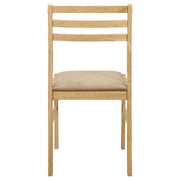 This lovely dining set lends an elegant touch of simple sophistication to a kitchen or breakfast nook. It comes complete with a lovely, round dining table and two comfy chairs upholstered in soft, light brown, padded fabric. The table is enhanced by a versatile drop-down extension which can be raised to accommodate an elaborate dining setup. Lowering it allows you to cozy up closely with a special someone over a leisurely breakfast or romantic, candlelit meal. A smooth, polished, natural wood finish gracefully complements the sleek, stylish silhouette of this beautiful three-piece set. Key Features: • Light and airy natural finish dining set is perfect for a casual breakfast nook • Round table with drop down leaves saves space • Chairs feature a contemporary rendition of a ladder back style • Padded seats in tan microfiber • Sold as a three piece all-inclusive set: Table plus two chairs