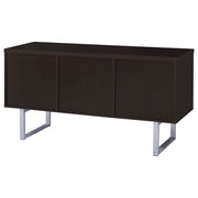 Extend the utility of an office desk with this beautiful credenza. Built with a linear silhouette, its minimalist design is flattering to a contemporary office. Cappuccino brings a dramatic finish. Metal u-shaped legs and hardware add perfect finishing touches. Storage and utility are top-notch with a top drawer, an open shelved compartment. and two file drawers. Key Features: • Classy office desk in cappuccino finish • Clean metal base in silver finish • Credenza features expanded space with three (3) storage drawers, two (2) file cabinets, and an open storage compartment with an adjustable shelf • File cabinet holds both legal and letter size files • Metal, MDF, particle board, and laminate construction