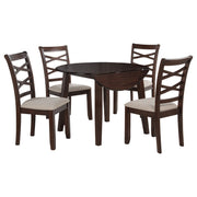 This five-piece dining set invites connection with timeless charm and everyday warmth. The round table, finished in rich dark brown, provides an intimate setting for shared meals and easy conversation. Four coordinating chairs feature gracefully curved double cross-backs and plush light tan upholstered seats that offer gentle support. Crafted from solid rubberwood, mango veneer, and soft-touch fabric, this set brings cozy elegance to kitchens, breakfast nooks, or dining spaces where comfort meets classic design. Key Features: • Five-piece dining set with round table and four cross-back upholstered dining chairs • Dark brown wood finish offers depth and warmth with classic appeal • Chairs feature gently curved double cross-backs for style and support • Light tan fabric seats are foam cushioned for comfortable daily dining • Crafted from solid rubberwood, mango veneer, engineered wood, and fabric • Perfect for breakfast nooks, kitchens, or small dining spaces with timeless style