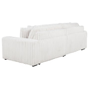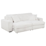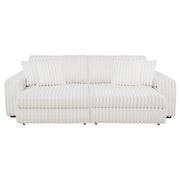 Striking and indulgently soft, this modern sofa set blends bold styling with innovative comfort. Deep vertical channel tufting enhances the rich corduroy upholstery, while dual power chaise functionality allows either side to extend independently, transforming the sofa into a full lounging surface. Wide arms, plush foam cushioning, and an integrated control panel with USB-A and USB-C charging bring next-level convenience. Designed for luxurious, tech-savvy relaxation. Key Features: • Contemporary sofa set in ivory corduroy features deep channel tufting and dual power chaise design • Each side of the sofa extends independently for custom comfort and spacious lounging • Wide padded arms and plush foam cushions offer sculptural comfort and bold modern form • Integrated control panels includes both USB-A and USB-C ports for convenient device charging • Corduroy fabric upholstery delivers rich texture and soft-touch appeal for everyday luxury • Crafted from soft fabric, foam cushioning, and durable plastic framing for long-lasting use