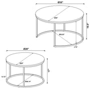 This nesting coffee table set offers a practical design, ideal for spaces that require versatility. Featuring two round tables with engineered wood tops and a grey faux marble finish, it complements modern and minimalist interiors. The durable metal frame with a gunmetal powder-coated finish provides strong support while enhancing the overall style. Perfect for compact spaces, these tables can be nested together or used separately, offering flexible functionality in your living room or office area. Key Features: • Nesting coffee table set features two round tables for versatile use and compact spaces • Engineered wood tops with a grey faux marble finish for a stylish, modern look • Gunmetal powder-coated metal frame provides strength and durability • Perfect for small living rooms, offices, or apartments with limited space • Faux marble surface offers a sleek, easy-to-clean top for everyday use • Tables nest together to save space or can be used separately for different layouts