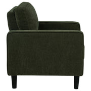 From your stylish home to a professional setting, this modern armchair is a chic choice. It features a structured silhouette with a compact footprint and straight track arms. Faux leather upholstery is smooth and sleek, offering a refined touch that can be styled for sophistication or relaxation. Sinuous spring decking supports an attached seat cushion, providing excellent support and comfort. The back includes webbing, with a structured profile defined with square track arms. Key Features: • Contemporary accent chair with a streamlined, compact design • Black faux leather upholstery adds a bold, modern touch to any space • Padded seat and back cushions ensure a supportive and cozy feel • Slim track arms contribute to a refined and stylish appearance • Tapered wooden legs provide excellent stability and lasting durability • Versatile as a standalone accent piece or part of a full seating set