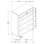 This mid-century modern five-drawer chest combines refined simplicity with thoughtful detail. A warm sand wash finish highlights the wire-brushed texture of the wood, creating natural depth and dimension. The aged brass knobs and slim metal legs add a sophisticated metallic accent, while softly rounded corners lend a smooth, contemporary look. A felt-lined top drawer offers a secure place for delicate items, making this chest a stylish and functional addition to any modern or transitional bedroom._x005F_x000D_ Key Features: • Five-drawer chest in warm sand wash wire-brushed wood finish • Aged brass knobs and legs add modern mid-century sophistication • Felt-lined top drawer protects jewelry and delicate accessories • Rounded corners create a soft, refined silhouette and smooth profile • Crafted from rubberwood, engineered wood, and ash veneer materials • Spacious drawers provide elegant and practical bedroom storage