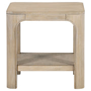 With its softened edges and grounded silhouette, this end table evokes casual refinement. A square top floats above subtly arched legs for sculptural appeal. Made from solid mahogany, engineered wood, and mango veneer, it offers lasting strength and natural texture. A lower shelf adds convenient storage, making this accent table as functional as it is timeless. Use it as a side table or occasional table in your living room or lounge. Key Features: • Square end table with shelf and sculpted legs for an elegant living room accent • Weathered mango finish reveals subtle grain and neutral organic texture • Lower open shelf adds extra storage space for everyday essentials or décor • Gently curved corners and rounded legs lend a soft, architectural silhouette • Crafted from mahogany, engineered wood, and mango veneer for lasting quality • Perfect as a side table or occasional table in casual or transitional spaces