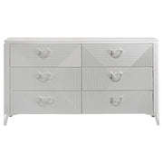 Sleek and sculptural, this six-drawer dresser pairs crisp white high gloss with dimensional detail for a bold modern look. Its geometric drawer fronts feature ribbed textures forming inverted V patterns, highlighted by polished chrome U-shaped pulls. Felt-lined top drawers add a refined interior touch, while smooth-gliding drawers operate on 45mm metal extension glides hardware. Finished with slender legs and clean lines, this dresser brings texture and brightness to contemporary bedrooms. Key Features: • Six-drawer dresser in white high gloss finish with geometric ribbed drawer front textures • Black felt-lined top drawers provide protective storage for delicate items or accessories • Equipped with 45mm metal extension drawer glides for smooth and durable performance • Polished chrome U-shaped drawer pulls add visual contrast and modern refinement • Distinctive V-pattern ribbing enhances the sculpted look of the front panel surfaces • Crafted from engineered wood for sleek finish and reliable support