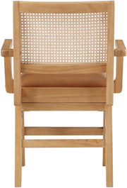 Sit back and relax in this armchair from Meridian Furniture's Abby collection. Featuring a frame crafted from solid wood with a natural finish and a vegan leather seat, this chair is both sturdy and durable so it will last you for years to come. A natural cane backrest seamlessly blends with the chair's natural-finished frame, adding a sense of warmth and charm that ensures it will stand out among all your furniture.