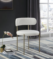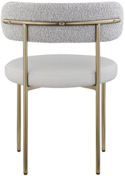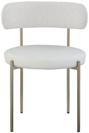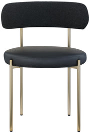 Give your dining room a modern boost with this Beacon vegan leather and boucle fabric dining chair. This pretty chair has the contemporary design elements you're looking for, from its curvy back to its thickly padded seat and brushed brass-finished metal frame. Vegan leather provides the look of the real thing without the maintenance requirements.