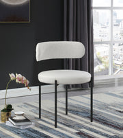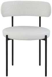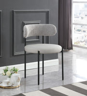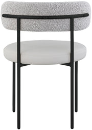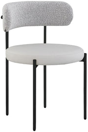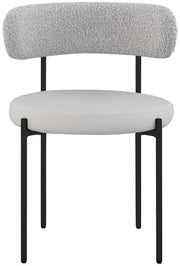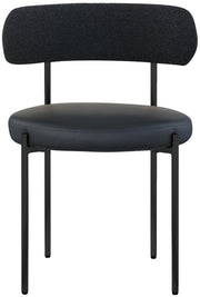 Bring modern comfort to the dining room with this Beacon vegan leather and boucle fabric dining chair. Exquisitely designed to be one part utilitarian seat and one part art, this stylish chair turns heads from all angles. The seat comes upholstered in vegan leather for a luxe look while the back is covered in rich boucle fabric. The iron metal frame features a matte black finish for an unmistakably modern look.