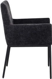 Casual comfort is the order of the day when dinner guests relax from the cozy confines of this Reeves soft chenille fabric dining chair. Sumptuously padded arms, back, and seat ensure total comfort from appetizers through dessert, and the neutral, solid-colored upholstered makes it easy to pair this dining chair with the table of your choice. An all-metal matte black frame and legs lend a contemporary finish and impeccable sturdiness and strength for long-term enjoyment.
