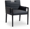A perfect fusion of modern elegance and eco-friendly luxury is the Aimee vegan leather dining armchair. Upholstered in sleek vegan leather, this chair offers a chic, contemporary look while maintaining a commitment to sustainable living. The padded, quilted design featuring solid black wood legs and armrests creates a stunning contrast between its soft upholstery and minimalist frame.