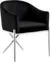 Spread elegance and modernity to your dining room with this Xavier velvet dining chair from Meridian Furniture. This beautiful chair features a simple barrel seat with a plush cushion and back, ensuring that every meal is a comfortable one. The steel legs provide durable support while you sit, and an "X" leg in the back lends the chair an uber-modern vibe. finishing on the base is sleek and chic, giving this chair a contemporary edge that's well at home in any modern dining room. Sleek velvet upholstery is durable and tough yet soft against your body, elevating meal times to a luxurious experience.