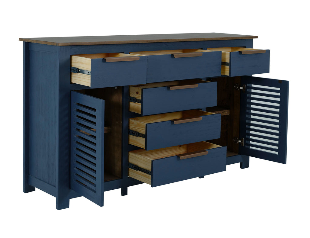 Designed with practicality in mind, the buffet includes six spacious drawers and two doors, providing ample storage for all your dining essentials. Its sleek metal pulls, featuring a modern rectangular design, are visually appealing and designed to resist chipping, ensuring longevity.
