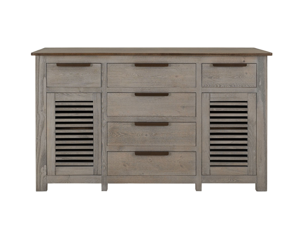 6 Drawer, 2 Door, Buffet. The Bonfire Buffet is an exquisite piece that effortlessly combines functionality with style, making it an ideal addition to any dining room. Featuring a striking ivory finish that beautifully contrasts with its rich top, this buffet is crafted from durable pine wood and okume veneer, ensuring it stands the test of time.