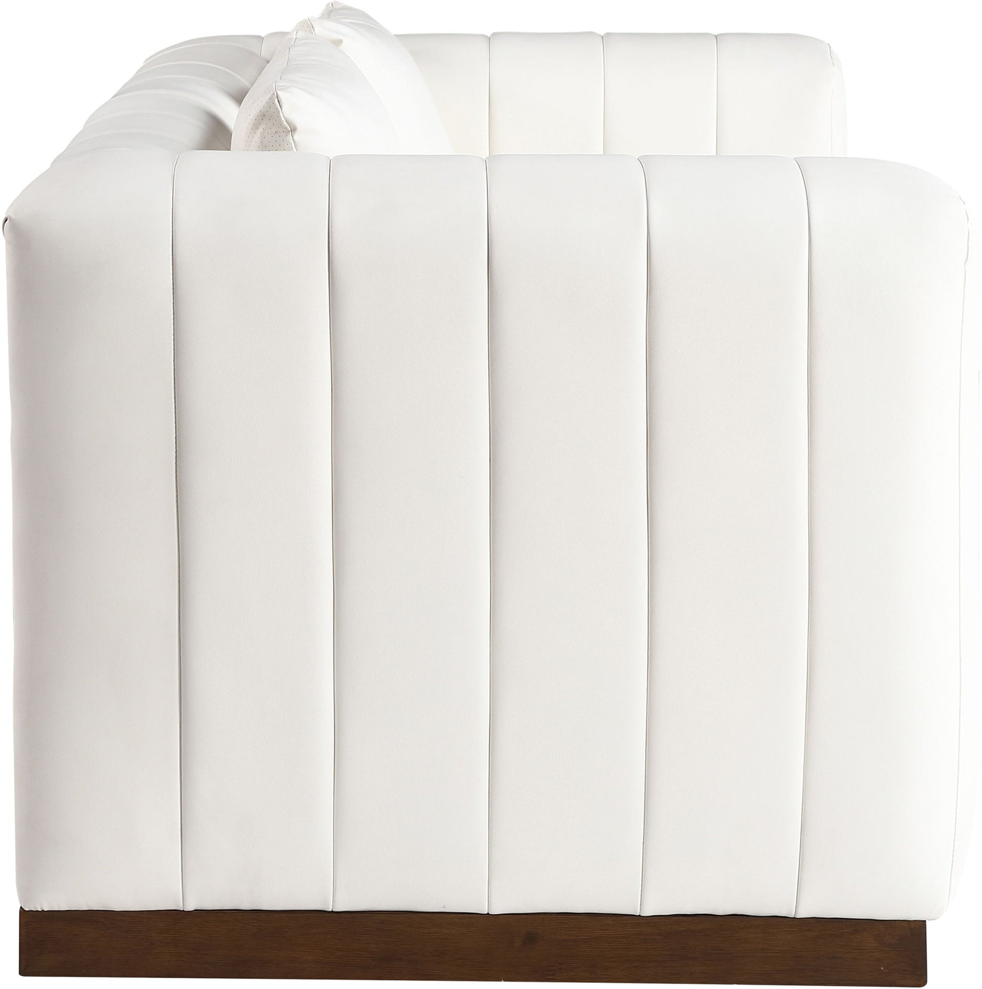 A minimalist masterpiece, the Mallina vegan leather loveseat combines form and function for a modern and stylish look. Its classic design and rich leather upholstery make it a sophisticated statement piece that will never go out of style. The clean lines, paired with a brown walnut finished base, create a sophisticated and inviting atmosphere.