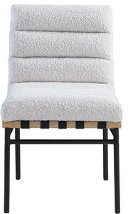 Keep guests sitting pretty for the entire meal with this Burke cream boucle fabricdining chair. This chair has rolled tufting for amazing support and durability and features an armless design that facilitates conversation between diners. A white oak veneer metal dowel on the back of the chair and under the seat lends additional interest to this modish dining chair option.