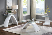 NAHARA Coffee Table, 47 1/4"L X 23 5/8"W X 18"H, 67.76lbs. It's a design that appeals to the imagination, an ambitious departure from typical table styles that haven't advanced enough over the years to keep up with evolving tastes. Each has a high-gloss wood base and elliptical tempered glass top. Individually or as a set they establish a mind-bending look worthy of the daring eye.
