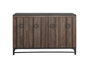 4 Door Console. The Ebano Console has a gorgeous top made from natural stone sourced from a quarry, which brings a touch of natural sophistication to any room. The sturdy metal base offers reliable support and creates a captivating contrast with the organic texture of the stone top. The doors are adorned with custom metal pulls and feature stunning brown tones, adding an extra layer of visual appeal. These distinctive characteristics make this piece of furniture unique and eye-catching.