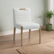 A perfect fusion of modern elegance and eco-friendly luxury is the Aimee vegan leather dining side chair. Upholstered in sleek vegan leather, this chair offers a chic, contemporary look while maintaining a commitment to sustainable living. The padded, quilted design featuring solid natural oak wood legs creates a stunning contrast between its soft upholstery and minimalist frame.