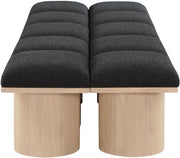 Bring valuable seating and remarkable style to your space with this Pavilion boucle fabric bench, an exquisite balance of style and usability for the entryway, bedroom, and beyond. Crafted from oak veneer with a natural finish, this bench has a 4-inch-thick seat cushion that's channel-tufted for a touch of luxury. The bench's columnar bases add a dash of art deco design, making it a captivating focal point in any room.