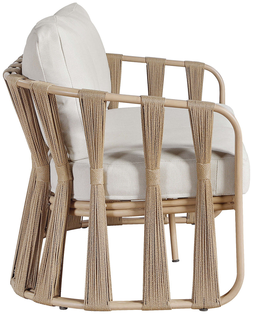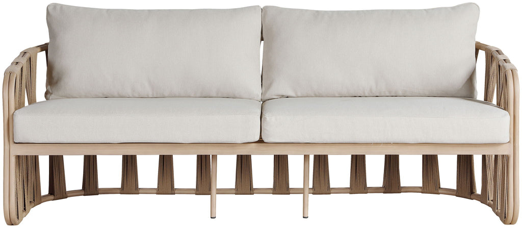 Woven polypropylene rope and resilient waterproof fabric give the San Pietro outdoor patio sofa a striking, art deco-inspired look. Wrapped in a natural aluminum teak frame, it's built to withstand the elements while maintaining its elegant appeal. Perfect for lounging outdoors, this piece blends sophisticated style with ultimate comfort.