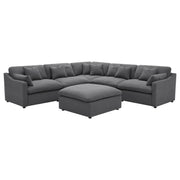 This modular sectional sofa blends modern style with luxurious comfort. Upholstered in soft performance fabric, it features feather blend-wrapped box cushions with reversible seating and backs for lasting support. Tailored topstitching and slim track arms create a sleek contemporary look, while plush accent pillows enhance comfort. Treated fabric resists moisture, allowing for easier maintenance and everyday durability. Designed for lounging, this sectional offers both elegance and versatility. Key Features: • Six-piece sectional in ivory fabric with slim track arms and tailored topstitching • Reversible seat and back cushions with feather blend filling provide soft comfort • Moisture-repellent treated fabric simplifies cleaning and everyday maintenance • Ottoman with plush cushion functions as footrest, coffee table, or extra seating • Accent pillows included to enhance comfort and complete the sectional design • Durable frame construction ensures strength and long-lasting living room use