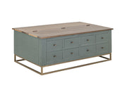 8 Drawers, Hinged Top Cocktail Table. The Timber Occasional Tables are remarkable furniture pieces that beautifully combine functionality and style. Designed to enhance your living room, these tables are crafted from high-quality pine and poplar wood and showcase a rich, multi-step lacquer in an eye-catching green finish. They are accented by a hand-rubbed brown top that enhances the wood's natural beauty. The cocktail coffee table offers deep storage beneath a hinged top and boasts eight drawers that glide smoothly on wood-on-wood slides, offering ample space for your essentials. Supported by a sleek gold metal base, the Timber Occasional Tables are an elegant and functional addition to any space.